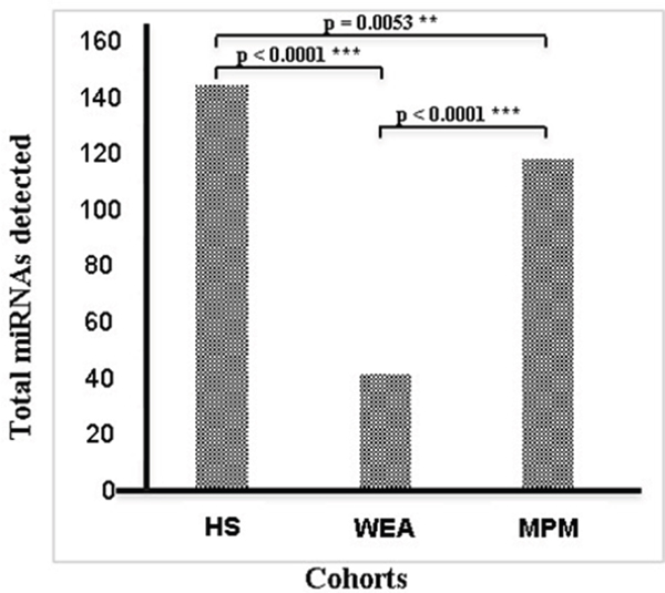 Figure 1: Total number of miRNAs detected in the three cohorts MPM, WEA and HS analyzed by microarray technology. The difference between: HS and MPM, i.e 145 vs 119, p=0.053; HS vs WEA, i.e. 145 vs 42, p<0.0001; MPM vs WEA, i.e. 119 vs 42, p<0.0001, are statistically significant.