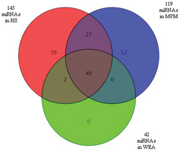Figure 2: Venn diagram showing miRNAs detected in sera from the three MPM, WEA, HS cohorts analyzed. MiRNAs (n=119) expressed in MPM are in blue, n=42 are those detected in WEA cohort, in gree, whereas n=145 are the miRNAs detected in HS, in red. MiRNAs n=52 are expressed in MPM samples only. N=76 are expressed in the HS only. None of the MiRNAs (n=42) detected in the WEA cohort was unique of this cohort. Indeed, n=40 were in common with MPM and HS, n=2 were in common with HS only. N=27 miRNAs were found in common between MPM and HS.
