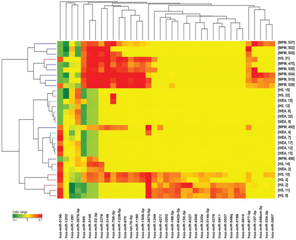 Among the 119 miRNAs expressed in MPM, 67 miRNAs were also detected in the control sample of HS. The remaining 52 miRNAs were expressed only in the MPM samples. In the WEA cohort 42 miRNAs were expressed, but none was expressed exclusively in this cohort. A total of 145 miRNAs were expressed in HS, i.e. 76 miRNAs were detected in this cohort only, whereas 27 were in common with MPM, 2 were in common with WEA and 40 were expressed in all the three groups of patients/subjects studied (Figure 2).