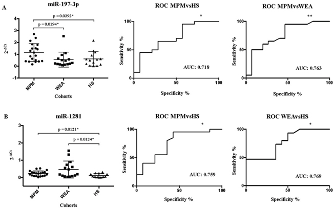Figure 4: Schematic representation of the Receiver Operating Characteristic (ROC). In Panel A the MiR-197-3p expression in MPM, WEA and HS cohorts in the X axis, detected by RT-qPCR, is represented as 2-ΔCt value in the Y axis. The ROC AUC for miR-197-3p ratio MPM vs HS, p = 0.0328*; 95% confidence interval 0.5398-0.8959, and MPM vs WEA, p = 0.0085**; 95% confidence interval 0.5981 to 0.9285. Panel B: MiR-1281 expression in sera from MPM patients, WEA and HS, by RT-qPCR. The ROC AUC for miR-1281 ratio MPM vs HS, p = 0.0112* 95% confidence interval 0.5885-0.9293 and confrontation WEA vs HS, p = 0.0137*; 95% confidence interval 0.5963-0.9418. The statistically significant p values are indicate with * and **.