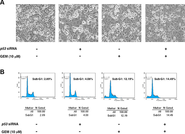 Figure 4: Knockdown of mutant p53 has a marginal effect on GEM-mediated cell death. (A) Phase-contrast micrographs. Panc-1 cells were transiently transfected with control siRNA or with siRNA against p53. Twenty-four hours after transfection, cells were treated with 10 μM of GEM or left untreated. Forty-eight hours after treatment, representative pictures were taken. (B) Flow cytometric analysis. Panc-1 cells were treated as in A. Forty-eight hours post GEM exposure, the adherent and floating cells were harvested and their DNA content was measured by flow cytometric analysis.