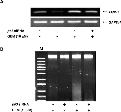 Figure 9: Silencing of p63 attenuates GEM-mediated DNA fragmentation. (A) Knockdown of p63. Panc-1 cells were transfected with control siRNA or with siRNA against p63. Twenty-four hours after transfection, cells were exposed to 10 μM of GEM or left untreated. Forty-eight hours after treatment, total RNA was isolated and analyzed by semi-quantitative RT-PCR. GAPDH was used as an internal control. (B) DNA fragmentation assay. Panc-1 cells were treated as in A. Forty-eight hours after treatment, floating and attached cells were harvested, their genomic DNA was prepared and subjected to agarose electrophoresis. M indicates the size marker.