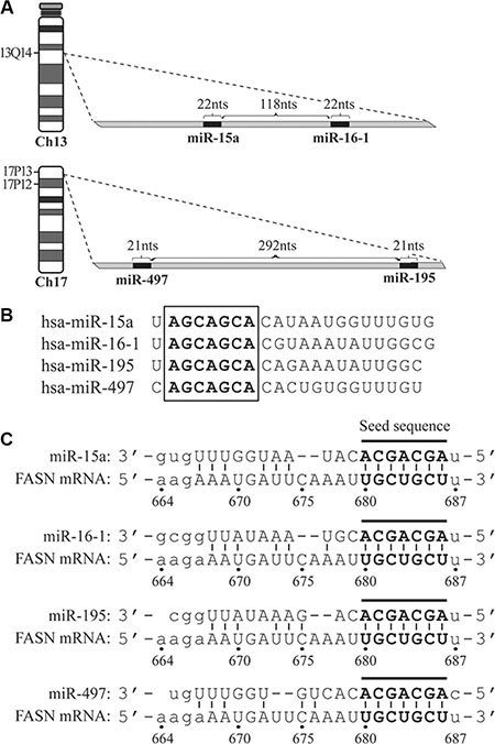 Figure 1: The schematic diagrams of genomic loci for microRNAs, their seed sequences and target site on the 3′-UTR of FASN mRNA. (A) Genomic loci of miR-15a-16-1 and miR-497-195 on chromosomes 13 and 17, respectively. (B) The seed sequences (in bold and embraced by a square) of miR-15a, miR-16-1, miR-497 and miR-195. (C) The target site of the four microRNAs on the FASN 3′-UTR. The matched nucleotides between microRNA seed sequences and target site are in bold and connected by short lines.