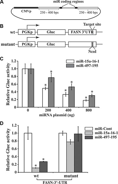 Figure 2: Reporter assays of FASN 3′-UTR-mediated expression regulated by microRNAs. (A) A schematic diagram of microRNA expressing plasmids. The constructs were generated using the genomic DNA sequence based on a previously reported protocol [40]. The pSL4 lentiviral vector with the CMV promoter to drive microRNA expression and a puromycin antibiotic selection marker is used to express the two microRNA clusters. (B) Schematic diagrams of reporter constructs. The wild type (wt) reporter vector, pPGK-Gluc-FASN-3UTR, consists of the PGK promoter, Gluc cDNA and FASN 3′-UTR. The target site of the miR-15a/miR-16-1 seed sequence is indicated. In the mutant reporter construct, 6 bps in this target site was replaced by a NcoI site. (C) Reporter assays to test the effects of miRNAs on the Gluc expression mediated by the FASN 3′-UTR. Increasing miR-15a-16-1 and miR-497-195 expression vectors (0, 200, 400 and 800 ng), compensated with a control miRNA vector to 800 ng, if necessary) were co-transfected with wt pPGK-Gluc-FASN-3UTR reporter (50 ng) presented in “A” and the SEAP-expressing plasmid (100 ng) into MCF-7 cells (triplicated). Gluc activity was determined and normalized by SEAP activity (see Materials and Methods for details). (D) To determine the importance of miRNA binding site on the FASN 3′-UTR in miRNA-mediated reporter expression. One hundred ng of miR-Cont (i.e. miR-m15a-m16-1), miR-15a-16-1 or miR-497-195 was co-transfected with 50 ng of the wt or mutant reporter construct (50 ng) and the SEAP-expressing plasmid (100 ng). Gluc activity was measured and normalized as described above. Results for C and D are presented as a mean of three observations ± S.D. Statistical significance is shown by *indicating a p value < 0.05.