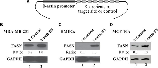 Figure 4: Effects of a sponge vector consisting of the miRNA binding site of the FASN 3′-UTR on endogenous FASN expression. (A) Schematic structure of the sponge vector consisting of 8 repeats of the miR-15a-16-1 target site present in the FASN 3′-UTR. The plasmid is based on pSL5 lentiviral vector and the expression is driven by the β-actin promoter. (B) (C) and (D) Effects of the sponge vector on endogenous FASN expression. MDA-MB-231 cells (B), HMECs (C) and MCF-10A cells (D) were infected by lentiviruses for the sponge vector (8 × miR-BS; BS: binding site) and the control (8 × Control). Two days post infection, cells were cultured in medium containing 1 μg/ml of puromycin for another 3 days. The cells were collected and analyzed by Western blot analyses using the indicated antibodies.