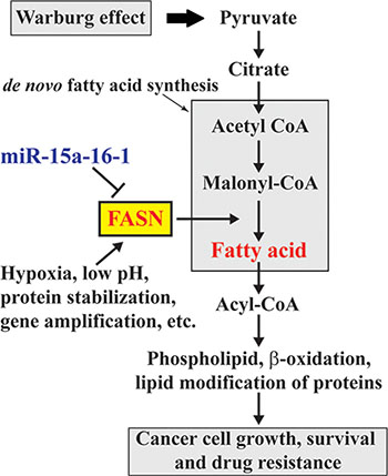FASN is overexpressed in cancers and plays an oncogenic role in cancer development and progression [1]. According to the Warburg effect, increased anaerobic glycolysis in cancer cells produces excess pyruvate, some of which can be converted to acetyl-CoA and used for de novo fatty acid synthesis. Elevated FASN promotes de novo fatty acid synthesis and leads to fatty acid accumulation, which alters various fundamental cellular process, including gene expression and signaling transduction, and ultimately promotes oncogenesis (Figure 6). Elevated FASN expression is mediated by multiple mechanisms. In this study, we demonstrated the negative regulation of FASN by miR-15a-16-1. Our data for the first time suggest that miR-15a-16-1 may suppress oncogenesis through blocking the downstream steps of the Warburg effect (Figure 6).