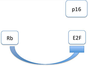 Figure 1: Interaction modell of p16INK4a in HPV negative cases: Tumoursuppressor Retinoblastoma gene (Rb) is inhibiting transcription factor E2F. As a consequence, p16INK4a is not affectd by E2F.