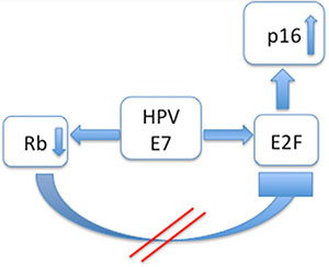 Figure 2: Interaction modell of p16INK4a in HPV positive cases: The HPV associated oncoprotein E7 acts in a double way: Rb is inhibited and E2F is promoted. As a result E2F is upregulated and p16INK4a is overexpressed.