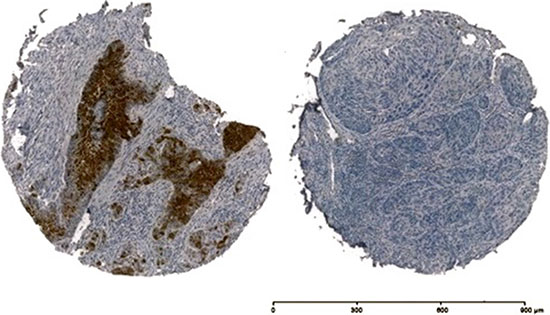 Figure 3: Immunohistochemistry of p16INK4a of two OSCC samples, on the left side p16INK4a + and on the right side p16INK4a.