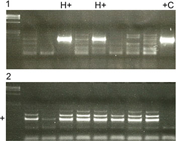 Figure 4: (1) PCR results for detecting HPV positive (H+) and negative cases (H−). A HPV positive cervix carcinoma was used as a positive control (+C). (2) A control PCR was performed in every case to detect sufficient amounts of DNA. If DNA amounts were insufficient as shown in row 2, DNA was newly extracted from FFPE. Otherwise a clear signal was seen in the specific row (+).