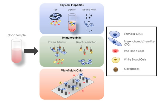 Figure 1: Different Approaches for CTC-Enrichment. There are different conventional approaches for CTC-enrichment, based on diverse biological features. A first group is based on physical properties of CTCs, such as size, density and electric charge. The second group is based on immunoaffinity. In this case positive-selective techniques use microbeads targeting CTC-specific antigen, whereas microbeads targeting red or white blood cells are used in negative-selective strategies. The third group is represented by microfluidic-based platforms that incorporate a combination of size- and immunoaffinity-based approaches, thus representing a combination of the previous two groups.