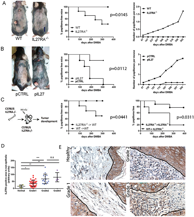 Figure 1: IL27 signaling promotes skin carcinogenesis. A. IL27RA-/- mice are resistant to cutaneous chemical carcinogenesis when compared to wildtype mice (photograph, left) as they have reduced incidence of papilloma formation over time (middle) when compared to wildtype mice and less papillomas per mouse when compared to control (right). N=8-10. Experiment repeated 3 times. p=0.0145 B. Gene therapy administration of plasmid IL27 enhances cutaneous chemical carcinogenesis in C57Bl/6 mice when compared to control plasmid (pCTRL) (photograph, left) as these mice have higher incidence of papilloma formation over time (middle) and higher number of papillomas per mouse when compared to mice treated with control plasmid (right). N=5. Experiment repeated twice. p=0.0112 C. Mice lacking IL27RA-/- in bone marrow cells are more resistant to cutaneous chemical carcinogenesis tumor development that mice with wildtype bone marrow cells irrespective of IL27RA in the non-bone marrow cells. P=0.0441 (left) and p=0.0311 (right) (N=6-9, repeated twice with similar results, WT (donor) → IL27RA-/- (recipient)). D, E. Quantification and representative photomicrographs of IL27RA positive cells in non-epithelial (stroma) compartment of skin derived from normal patients, or patients with SCC at different grades. E- epidermis, D- dermis, S- stroma, T- tumor.