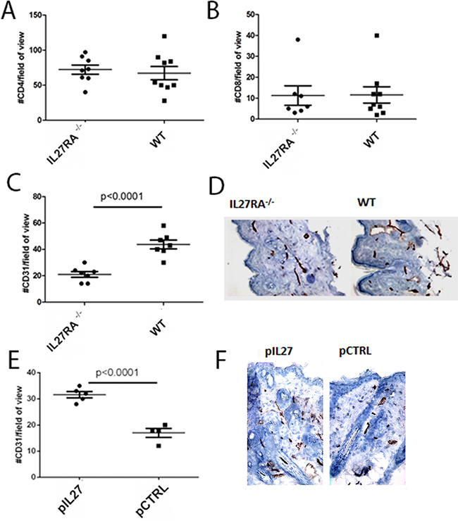 Figure 2: IL27 induces angiogenesis in the pre-malignant skin. A, B. Similar number of CD4 (A) or CD8 (B) T cells accumulation in the dermis of wildtype or IL27RA-/- 8 months post treatment with DMBA/BP. C, D. IL27RA-/- had significantly lower vessel density (CD31) in the dermis when compared to wildtype ones 8 months post treatment. E, F. Gene therapy administration of plasmid IL27 significantly enhanced vessel density (CD31) in the dermis when compared to control ones. Photomicrographs were taken at 200X. *, p <0.05.