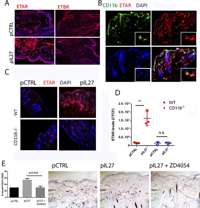 Figure 4: CD11B cells are required for IL27-induced angiogenesis via upregulation of Endothelin Receptor A in the pre-malignant niche. A. Immunofluorescence analysis showed that IL27 increases Endothelin A receptor levels but not Endothelin B receptor levels in the skin. (B) Immunofluorescence analysis showed ETAR co-stained with Cd11b marker in the skin. Nuclear staining was visualized with DAPI. B, C. Immunofluorescence (B) and quantification analysis (C) revealed that IL27-mediated increase in ETAR levels in the pre-malignant skin of wildtype mice was absent in the skin of IL27- treated CD11b-/- mice when compared to control ones. Skin tissue was analyzed 3 weeks post IL27 treatment. E, F. Immunohistochemistry analysis showed that the zibotentan (ZD4054) treatment for 3 weeks reversed IL27-mediated increase in vessel density in the premalignant skin (N=3 from independent mice). Photomicrographs were taken at 200X. *, p <0.05.
