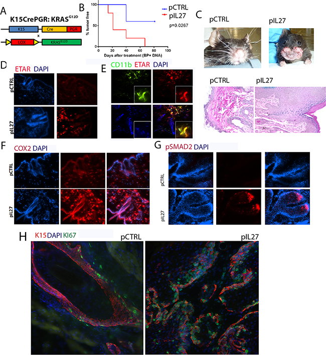 Figure 5: IL27 enhances papilloma formation in the skin and proliferation of mutated stem cells. A. Schematic representation of the generation of the K15:KRASG12D mouse. B. Gene therapy administration of plasmid IL27 and topical administration of BP treatment enhances visible papilloma induction in K15:KRASG12D mice when compared to control plasmid (pCTRL) and BP. Induction of mutant KRAS in 6-8 week old K15-KRASG12D. N=3-5 mice per group; experiment was repeated twice C. Macroscopic phenotype and HE of papilloma appearance in K15:KRASG12D mice. D, E, F. Immunofluorescence analysis showing increase in ETAR staining (D), ETAR-positive CD11b-positve cells (40X) (E) and COX2 levels (F), were increased in the skin of K15-KRASG12D 3 weeks post IL27 treatment via gene therapy when compared to control (200X). G. Immunofluorescence analysis showed pSMAD2 levels were increased in the papillomas from IL27- treated K15-KRASG12D when compared to control plasmid treated mice (Skin tissue was analyzed 10 weeks post KRAS induction; pictures were taken at 200X). H. Immunofluorescence analysis showed higher number of Ki67-positive K15 stem cells in the papillomas of mice treated with IL27 when compared to control plasmid (Skin tissue was analyzed 10 weeks post KRASD12D induction, 200X). Nuclear staining was visualized with DAPI.