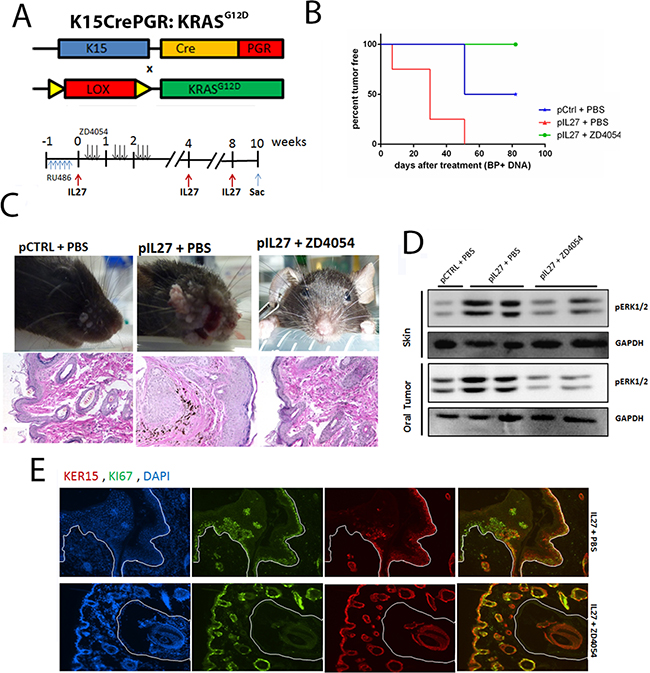 Figure 6: IL27 enhances papilloma formation and proliferation of mutated bulge stem cells via ETAR. A. Model describing the experimental design of the ZD4054 administration in the K15:KRASG12D mouse. B. Gene therapy administration of plasmid IL27 and topical administration of BP treatment enhances visible papilloma induction in K15:KRASG12D mice when compared to control plasmid (pCTRL) and BP while inhibitions of ETAR via ZD4054 reverses IL27’s ability to promote papillomas. Induction of mutant KRAS in 6-8 week old K15-KRASG12D. N=3-4 mice per group; experiment repeated twice. C. Macroscopic phenotype and HE of papilloma appearance in K15:KRASG12D mice treated with control DNA, IL27 and vehicle control, or IL27 and ZD4054. D. Western blot showing that inhibition of ETAR signaling reverses IL27’s ability to increase pERK1/2 levels in both pre-malignant skin and oral tumors (each lane is independent mice). E. Immunofluorescence analysis showing reduced number of Ki67-positive K15 stem cells in the papillomas of mice treated with IL27 and ZD4054 when compared to IL27 plasmid and vehicle control. (D, E) Skin tissue was analyzed 10 weeks post KRAS activation at 200X. Nuclear staining was visualized with DAPI.