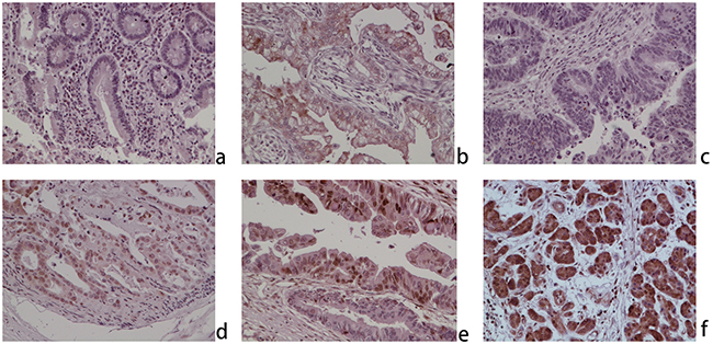 Figure 1: ZNF703 is overexpressed in human cholangiocarcinoma through immunohistochemical analysis (original magnification, x100). a. Negative expression in normal cholangitic mucosa; b. weak positive nuclear and cytoplasmic expression in normal cholangitic mucosa; c. negative expression in CCA; d. weak positive nuclear and cytoplasmic expression in CCA; e. moderate positive nuclear and cytoplasmic expression in CCA; f. positive nuclear and cytoplasmic expression in CCA.