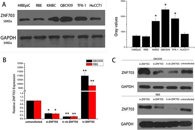 Figure 2: Expression of ZNF703 is elevated in cholangiocarcinoma cell lines. A. Western blot analysis was selected to detect the different expression level of ZNF703 in the normal HIBEpiC cell lineand other five CCA cell lines, RBE, KMBC, QBC939, TFFK-1 and HuCCT1, which revealed an elevated expression in cholangiocarcinoma cell lines. B, C. si-RNA and lentivirus mediated RNA interference were conducted in QBC939 and RBE cell lines, followed by real-time PCR analysis and western blot to confirm the overexpression and inhibition of ZNF703. Data are presented as mean ± SD from six independent experiments, *P <0.05, **P<0.01.