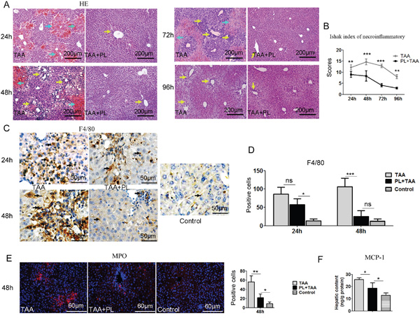 Figure 2: Plumbagin decreased congestion and inflammatory cell infiltration and macrophage recruitment in the FHF model. A. Congestion (cyan arrows) and inflammatory cell infiltration (yellow arrows) was assayed using HE staining. B. Necroinflammatory scores were determined using the Ishak classification. C. Immunostaining of F4/80 (black arrows). D. Positive cells of F4/80 were assessed by manual method. E. Immunostaining of MPO. Left panel, pictures; right panel, quantification of left images. F. Hepatic content of MCP-1. Representative images are shown for all panels. ns (not significant), * p<0.05, **p< 0.01; ***p< 0.001. Data are expressed as means ± SD. Statistical analyses were performed using Student’s t test.