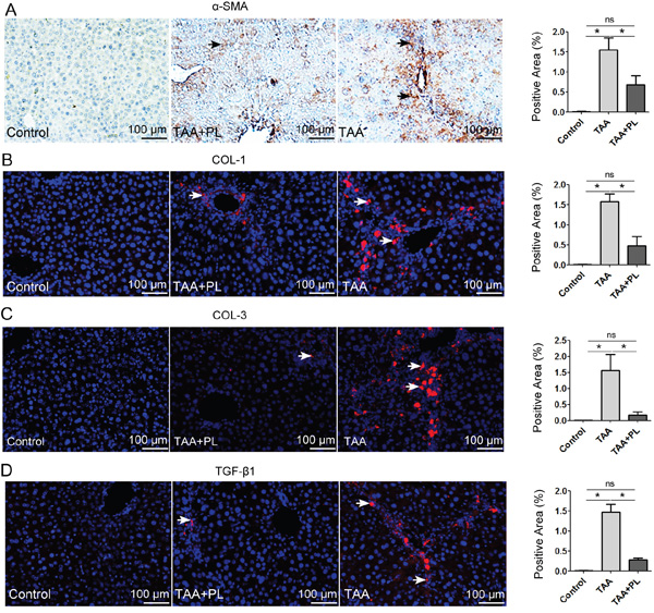 Figure 4: Immunofluorescence assays of HSCs/myofibroblasts. A. α-SMA, a marker of activated HSCs/myofibroblasts; B. COL-1 and C. COL-3, markers of ECM produced by HSCs/myofibroblasts; D. TGF-β1. The TGF-β1 signal is involved in HSCs/myofibroblasts. HRP-(brown) or Alexa 555 (red)-conjugated secondary antibodies were used. The sections were counterstained with hematoxylin (dark blue) or DAPI (blue). Representative images are shown for all panels. The column charts given in figure are means ± SD values from three separate experiments.*p< 0.05; **p< 0.01. Statistical analyses were performed using Student’s t test.