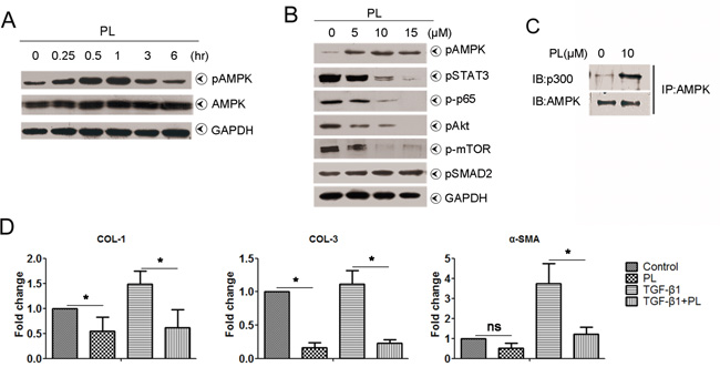 Figure 6: Effects of plumbagin on human hepatic stellate cells. A. Plumbagin promoted pAMPK levels in a time-dependent manner. LX-2 cells were treated with 10 μM plumbagin for the indicated times, and pAMPK levels were analyzed. B. Plumbagin inhibited pSTAT3, p-p65, pAkt and p-mTOR levels in a dose-dependent manner. However, plumbagin had no effect on pSMAD2. LX-2 cells were first treated with the indicated concentrations of plumbagin for 1 h after incubation. Whole cells were harvested and analyzed using Western blots for pAMPK, pSTAT3, p-p65, pAkt, p-mTOR and pSMAD2. GAPDH was used as a loading control. C. Plumbagin facilitated the bind of AMPK with p300. LX-2 cells were treated with 10 μM plumbagin for 1 h, and cell lysates were immunoprecipitated using an anti-AMPK antibody, followed by immunoblotting with an anti-p300 or anti-AMPK antibody. D. Plumbagin decreased mRNA level of fibrosis-associated genes. LX-2 cells were treated with plumbagin (200 ng/ml) or TGF-β1 (2 ng/ml) or combination for 24 h, and then total RNA were extracted for quantitative PCR of COL-1, COL-3 and α-SMA. Representative images are shown for all panels. Data are expressed as means ± SD. *p< 0.05; **p< 0.01. p values were calculated using a two-sided Student’s t test.