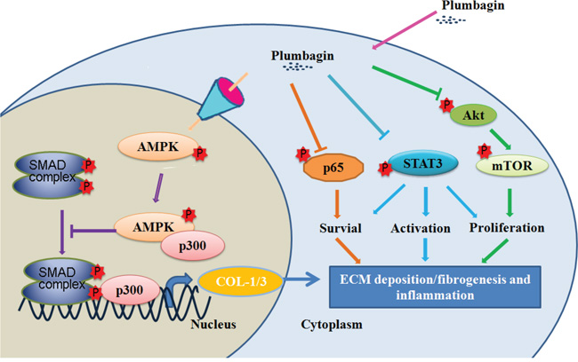 Figure 7: Liver protection mechanism of plumbagin. Plumbagin increased AMPK phosphorylation that promoted AMPK binding to p300, which is a SMAD transcriptional cofactor. This may further competitively decreases the p300/SMAD complex initiated transcription for COL-1/3 and α-SMA. Plumbagin also attenuated NF-κB, STAT3, and Akt/mTOR signals in LX-2 cells, which were involved in pro-inflammation and survival of HSCs/myofibroblasts. In conclusion, these findings indicate that plumbagin may be a powerful drug candidate to protect the liver from acute and chronic damage by inhibiting inflammation and collagen production.