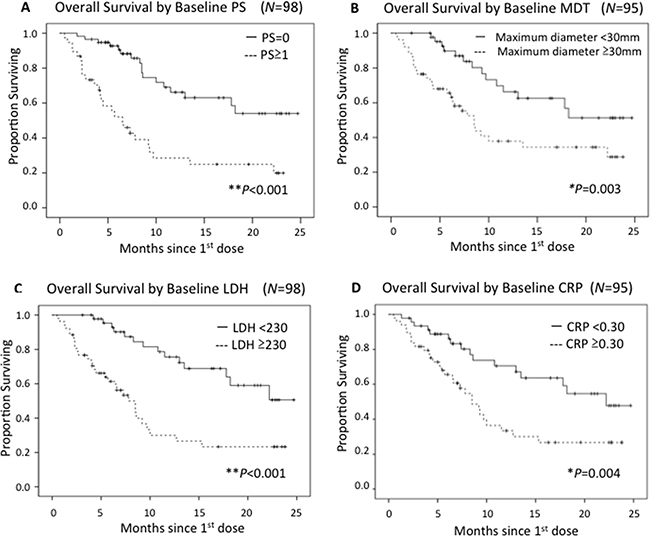 In this study, as in prior investigations of ipilimumab, LDH and CRP were shown to be baseline prognostic factors. Multivariate analysis of relationships between pretreatment levels of PS, MDT, CRP and LDH with OS are shown in Table 4A. PS and LDH were identified as independent variables, while MDT and CRP were not. MDT and CRP might simply reflect tumor burden or disease progression, in parallel with rising LDH. In addition, these pretreatment factors could simply reflect patients’ conditions, rather than nivolumab efficacy itself. If true, these results raise the possibility that nivolumab may not have sufficient efficacy in patients with a massive tumor burden.