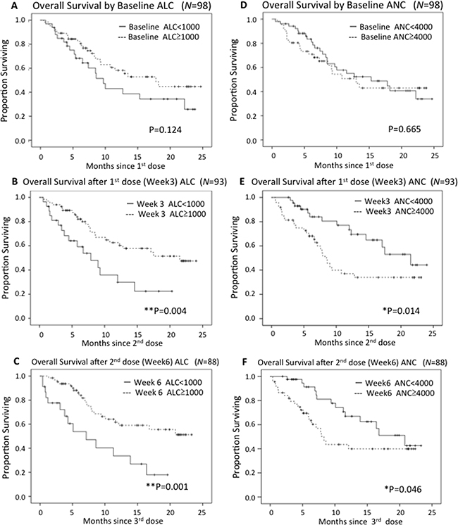 As for NLR, while baseline NLR was not significantly associated with OS, the patients with NLR≥4 at Week 3 tended to have poorer OS than those with lower NLR (comparison between NLR<4 and NLR≥4, Baseline: HR 0.65, 95%CI 0.36-1.17, P=0.147, Week3: HR 0.36, 95%CI 0.19-0.67, P= 0.001, Week6: HR 0.28, 95%CI 0.28-1.08, P=0.056) (Supplementary Figure H-J).