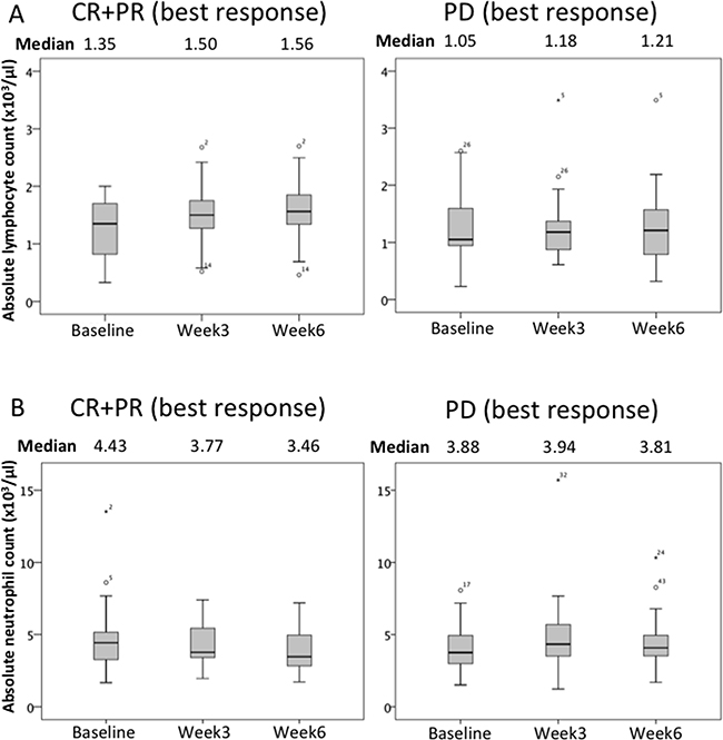 As to early markers for outcome, patients with high ALC and low ANC at week 3 and week 6 had significantly longer OS. Multivariate analysis of relationships between ALC and ANC at 3 and 6 weeks are shown in Table 4B. ALC and ANC were found to be independent variables. Good outcomes of patients with ALC≥1000 during treatment were likewise obtained in an ipilimumab study [19, 23, 24]. Though median ALC was also elevated in PD patients (ALC was increased as compared with baseline; CR+PR: 3W 13/22, 6W 15/22, PD: 3W 21/52, 6W 22/52), ALCs of non-responsive patients tended to be lower than those of the responsive subgroup (Figure 3).
