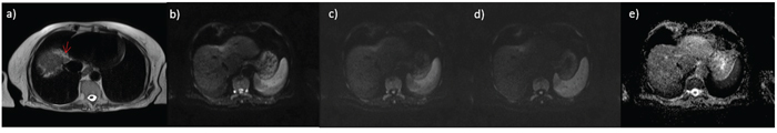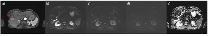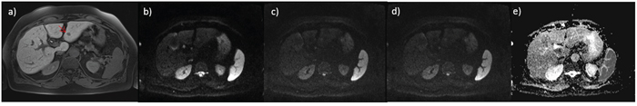 Figure 1: small HCC on IV hepatic segment G1; in a. HASTE T2-wejgthed image, in b. DWI image at b value 50 s/mm2, in c. DWI image at b value 400 s/mm2, in d. DWI image at b value 800 s/mm2 and in e. ADC map.