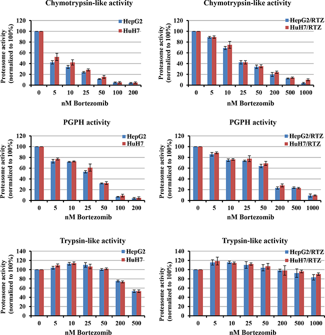 Chymotrypsin-like and peptidylglutamyl-peptide hydrolyzing (PGPH) activities in bortezomib-resistant HCC cells are inhibited by much higher concentrations of bortezomib than in wild-type cells