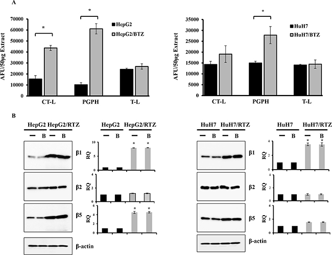 Figure 3: Bortezomib-resistant HCC cells show higher expression of constitutive proteasome subunits. A. The three individual basal activities (CT-L, T-L and PGPH) of proteasomes in wild-type HCC cells were compared with those in bortezomib-resistant HCC cells. Proteasome extracts were prepared from HCC cells. The basal activities of CT-L, T-L, and PGPH were measured using specific fluorogenic peptide substrates for each activity. All results represent the mean ± SD of three independent experiments. *: P<0.01 as compared with the respective control. B. Western blot of proteasome subunits (β1, β2 and β5) and β-actin in wild-type HepG2, HepG2/BTZ, wild-type HuH7 and HuH7/BTZ cells treated with or without 30 nM bortezomib (B) for 24 h. RQ, relative quantity.