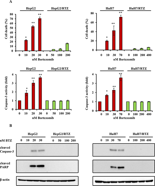 Figure 4: The dose-dependent analysis of caspase-3 activity and the expression of apoptosis-associated proteins in bortezomib-resistant HCC cells and their parental cells. A. Wild-type HepG2, HepG2/BTZ, wild-type HuH7, and HuH7/BTZ cells were treated with various concentrations of bortezomib for 48 h. Apoptosis was then measured by cell viability and caspase-3 activity. **: P<0.01; *: P<0.05 as compared with the respective control. Data are the mean ± SD of three independent experiments. B. Wild-type HepG2, HepG2/BTZ, wild-type HuH7, and HuH7/BTZ cells were treated with various concentrations of bortezomib for 48 h. Expression levels of cleaved PARP, cleaved caspase-3, and β-actin (loading control) were evaluated by western blot analyses. BTZ, bortezomib.