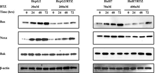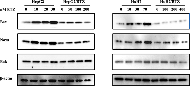 Figure 5: The dose-dependent analysis of Bcl-2 family proteins in bortezomib-resistant HCC cells and their parental cells. Wild-type HepG2, HepG2/BTZ, wild-type HuH7, and HuH7/BTZ cells were treated with bortezomib at various concentrations for 48 h. Expression levels of Bax, Noxa, Bak, and β-actin (loading control) were evaluated by western blot analyses. BTZ, bortezomib.