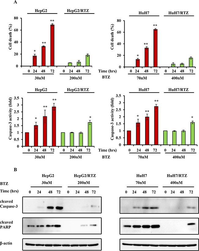 Figure 6: The time-dependent analysis of caspase-3 activity and the expression of apoptosis-associated proteins in bortezomib-resistant HCC cells and their parental cells. A. Wild-type HepG2, HepG2/BTZ, wild-type HuH7, and HuH7/BTZ cells were treated with bortezomib for various times and then apoptosis was measured by cell viability and caspase-3 activity. **: P<0.01; *: P<0.05 as compared with the respective control. Data are the mean ± SD of three independent experiments. B. Wild-type HepG2, HepG2/BTZ, wild-type HuH7, and HuH7/BTZ cells were exposed to bortezomib for the indicated times. Expression levels of cleaved PARP, cleaved caspase-3, and β-actin (loading control) were evaluated by western blot analyses. BTZ, bortezomib.