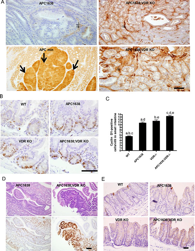 Figure 2: VDR deficiency does not increase β-catenin nuclear localization in tumor sections of Apc1638N/+Vdr−/− mice compared to that of Apcmin/+ but significantly activates cyclin D1 gene expression at the crypt base of normal epithelia and tumor cells in Apc1638N/+Vdr−/− mice. (A) Immunostaining of β-catenin localization using an anti-active β-catenin antibody in tumor sections of Apc1638N/+ (upper left), Apcmin/+ (lower left), and Apc1638N/+Vdr−/−(upper/lower right). Representative images are shown. Arrows indicate β-catenin in the nucleus and arrowheads depict staining of β-catenin in the stroma. Scale bar, 50 μm. (B) Immunostaining of cyclin D1, a β-catenin target gene, in normal crypt base epithelial cells of each genotype analyzed. Scale bar, 100 μm. (C) Representative images with quantification of cyclin D1 positive cells in sections of normal epithelial cells from each genotype examined. Cells with blue nuclei were considered negative, while cells with brown nuclei were considered positive. The expression of cyclin-D1 was calculated as number of positive cells in 25 complete crypts from at least 3 mice of each genotype. Data are presented as mean ± SEM. aP = 0.0001, bP = 0.0001, cP < 0.0001, dP < 0.0001, eP = 0.0047 determined by two-tailed t-test. (D) Representative hematoxylin/eosin staining of tumors derived from Apc1638N/+ (upper left) and Apc1638N/+Vdr−/− mice (upper right) with Immunostaining of cyclin D1 using an antibody in colon tumor sections of Apc1638N/+ (lower left) and Apc1638N/+Vdr−/− mice (lower right). Scale bar, 50 μm. (E) Analysis of apoptotic cells by immunostaining of normal large intestinal cells with an anti-active caspase-3 antibody in sections from proximal colon of each genotype analyzed. Representative images are shown. Scale bar, 50 μm.