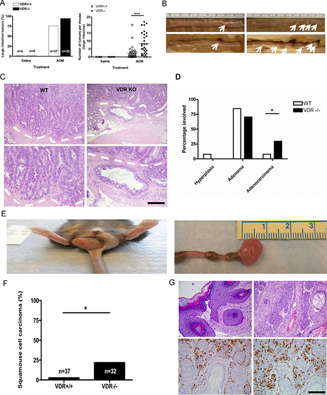 Figure 3: Treatment with azoxymethane does not affect tumor incidence but significantly increases tumor multiplicity in VDR KO mice. (A) Comparison of intestinal tumor incidence (left) and multiplicity (right) between Vdr+/+ (n = 37, tumor multiplicity 2.270 ± 0.6183 ) and Vdr−/− (n = 32, tumor multiplicity 8.344 ± 1.209 ***P < 0.0001, Two-tailed Student’s t test) mice. Each dot corresponds to one mouse and the horizontal line indicates the mean. (B) Representative images of tumors induced by AOM injection in large intestine from Vdr+/+ (left) and Vdr−/− (right) mice. White arrows indicates tumor observed in each genotypes. (C) Representative hematoxylin/eosin staining images of intestinal tumors from Vdr+/+ (upper left) and Vdr−/− (upper right) with magnified images in the lower panel. The dashed line demarcates adenocarcinoma observed in VDR KO mice. Scale bar, 100 μm. (D) Comparison of tumor progression to adenoma or adenocarcinoma between Vdr+/+ and Vdr−/− mice (*P < 0.0375, Two-tailed Fisher’s test). (E) Representative image of squamous cell carcinoma in the anus of Vdr−/− mice. (F) Comparison of squamous cell carcinoma incidence between Vdr+/+(n = 37) and Vdr−/− mice (n = 32 *P < 0.0208 Fisher’s exact test). (G) Representative hematoxylin/eosin staining images of squamous cell carcinoma from Vdr−/− (upper panel) and immunostaining of activated β-catenin (lower left) and cyclin D1 in tumor sections (lower right). Scale bar, 100 μm.