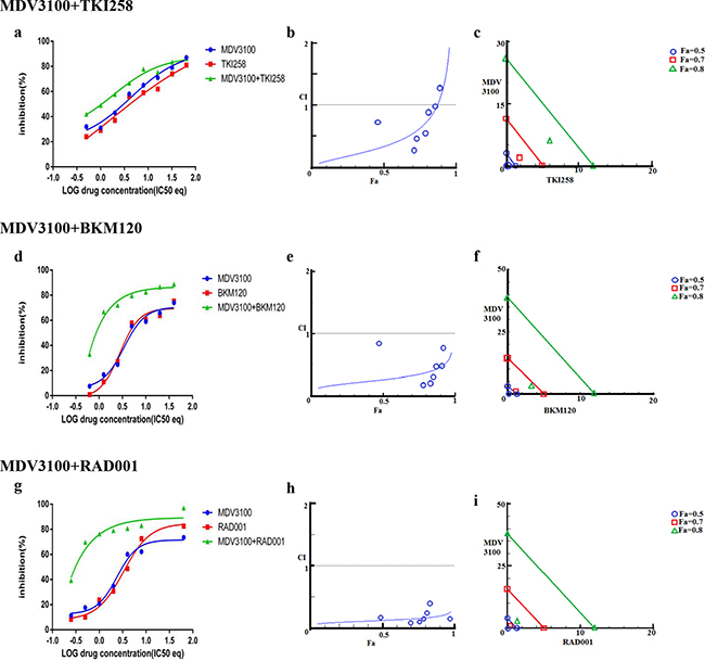 Figure 3: Combination effect of therapies targeting the AR- and PI3K pathway. LNCaP cells were treated with the indicated combination of the drugs and analyzed as described in Methods and Supplementary Figure S1. Left column (a, d and g): Curve shift analysis. Degree of left shifted indicated the amount of synergism with the indicated drug-combination. Middle column (b, e and h): Fa-CI plot. Blue values above the gray horizontal ‘additive’ line indicates trends towards antagonism. Low CI values with increased in Fa values suggest better compatibility and high synergism between the drugs. Right column (c, f and i): Isobolograms: The green, red and blue lines indicate where the theoretical additive line is for a particular Fa value (here, green, Fa 0.8, red Fa 0.7 and blue Fa 0.5. The closer the calculated values fall towards the origin, the greater the synergy between the drugs.