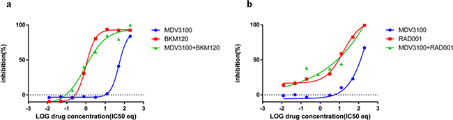 Due to the recurrent loss of PTEN in PCa, BKM120, the inhibitor of PI3K, presents one of the most promising alternatives for PCa treatments. As mentioned above, the CI value can change with Fa and might result in reduced synergy between drugs, especially at high concentrations. To test whether an antagonistic effect existed between MDV3100 and BKM120 (as observed with BKM120 and TKI258 in PC3 cell) or MDV3100 and RAD001, we studied the two-drug combinations in PC3 cells, which have lost both AR and PTEN expression. The curve-shift plot in Figure 5a shows that combining BKM120 with MDV3100 is similar to the effect of BKM120 treatment alone. Similarly, the effect of combining MDV3100+RAD001 is the same as RAD001 alone, albeit slightly lower than BKM120 combination, Figure 5b. Thus, the presence of MDV3100 does not seem to affect the inhibitory property of BKM120 or RAD001.