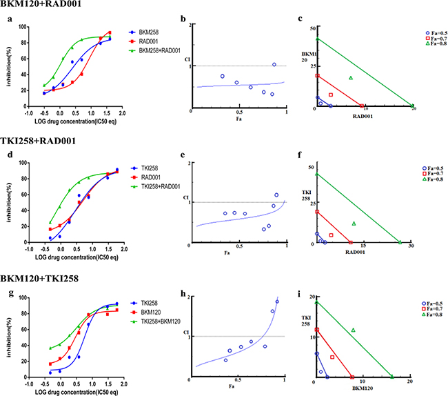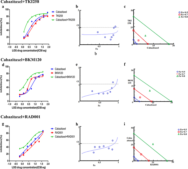 In addition to testing the combination effect of targeted therapies, we investigated the combination effect of chemotherapy drug cabazitaxel with a PI3K-pathway inhibitor (BKM120, TKI258 or RAD001). Cabazitaxel is FDA approved drug to treat metastatic hormone refractory prostate cancer [4, 34]. When LNCaP and PC3 cells were treated with a PI3K-pathway inhibitor in combination with Cabazitaxel, comparable levels of synergism were observed in both the cell lines. The CI values ranged between 0.46-0.74 suggesting moderate to slight synergism (Table 2). In general, the CI value of cabazitaxel in combination with a targeted therapy was higher (less synergistic) than the CI value of two targeted therapies that included one of the same drugs, Table 2 and Figure 8 and 9(a, d, g). Interestingly, however, the cabazitaxel+BKM120 combination in LNCaP cells displayed no trends towards antagonism in the Fa-CI plot and distinct curve shift in the dose-response plot, Figure 8e. Intriguingly, in PC3 cells, the combination of cabazitaxel with BKM120 was more synergistic (CI 0.47) than BKM120+TKI258 (CI 0.77), Figure 8 and Table 2. Taken together, this suggests that using the combination of a PI3K inhibitor, especially BKM120, with cabazitaxel could have treatment benefit beyond that of using cabazitaxel alone. Overall, no significant antagonism was observed with any drug-combination in the PCa cell lines tested.