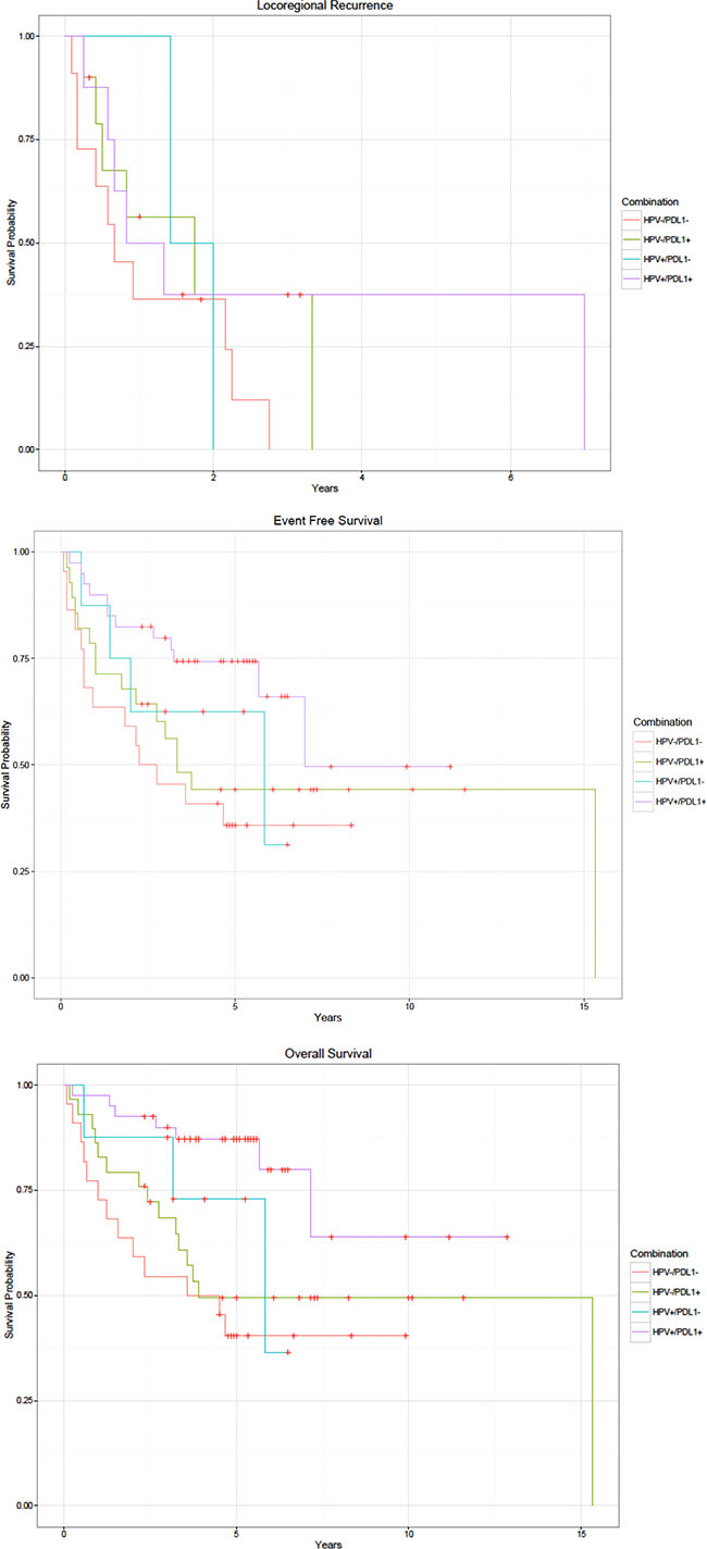 Figure 1: Kaplan-Meier curves by HPV and PD-L1 status. (A) Locoregional recurrence. (B) Event free survival. (C) Overall survival.