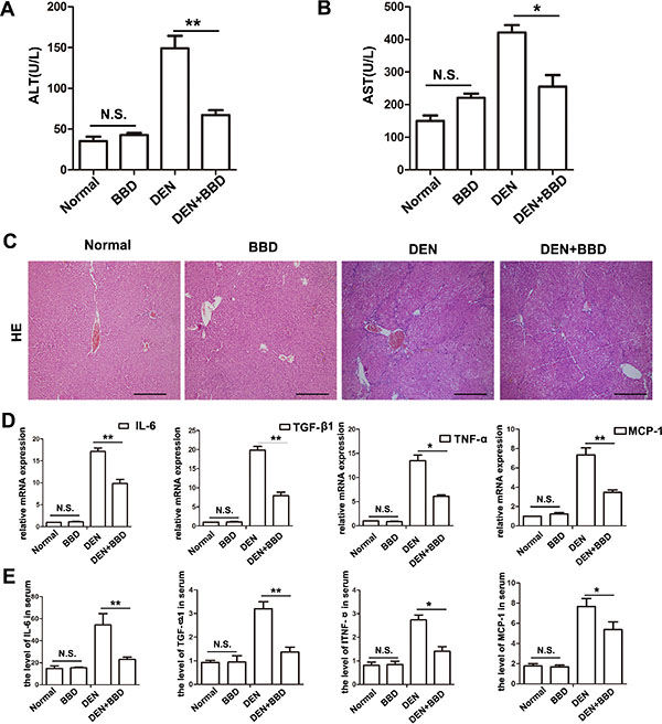 Figure 1: BBD ameliorated liver injury and inflammation in DEN-injured rats. DEN was used to build a fibrotic model for studying the effect of BBD. Peripheral vein serum of each rat was collected at 8th week. Then, the levels of ALT (A) and AST (B) were measured to reflect liver injure. (C) HE staining (× 200) was performed to reflect hepatocyte injured and inflammatory cells infiltration. (D) The expression of inflammatory cytokines were abstracted from each fresh liver tissue and measured by RT-PCR. (E) The level of inflammatory cytokines in peripheral vein serum was also analyzed by ELISA. The unit is ng/L. Compared to DEN group, *P < 0.05; **P < 0.01; compared to Normal group, NS: no significance, by two-tailed Student’s t test, n = 8, bar = 1 mm.