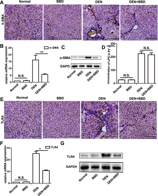 Figure 3: BBD inhibited hepatic stellate cells activation and the expression of TLR4 without attenuating the concentration of LPS. 4-μm-thick paraffin-embedded liver section was using for immunohistochemical staining (IHC). (A–C)The protein expression of α-SMA (× 200), a marker of activated HSCs, was analyzed by IHC, and quantitative measured by RT-PCR and Western blot. (D) Concentration of LPS in portal vein serum was detected by Rat endotoxin ElISA test kit. (E–G) The protein expression of TLR4 (× 200), a receptor specially bind to LPS, was determined by IHC, and also quantitative measured by RT-PCR and Western blot. Compared to DEN group, *P < 0.05; **P < 0.01, compared to Normal group, NS: no significance, by two-tailed Student’s t test, n = 8, bar = 1 mm.