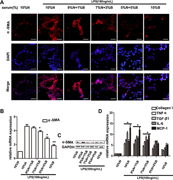 Figure 4: BBD-serum inhibited the LPS-induced HSCs activation. Primary HSC was isolated and cultured with LPS and different gradient concentration of BBD-serum for 72 h. (A) Immunofluorescence staining was performed to identify the activated HSCs by α-SMA (× 200), bar = 100 um and the mRNA of α-SMA was determined by RT-PCR and western blot (B and C). (D) The collagen and inflammatory cytokines secreted by HSCs were also determined by RT-PCR. Compared to 10% N with LPS group, *P < 0.05; **P < 0.01, by two-tailed Student’s t test, N: normal-serum; B: BBD-serum.