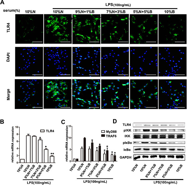 Figure 5: BBD-serum inhibited the LPS-induced HSCs activation by blocking NF-κB signaling pathway. Primary HSC was isolated and cultured with LPS and different gradient concentration of BBD-serum for 72 h. (A) Immunofluorescence staining was performed to identify the expression of TLR4 (× 200), bar = 100 um and the mRNA of TLR4 was determined by RT-PCR (B). (C) Downstream genes of TLR4 were detected by RT-PCR. (D) Quantitative analysis of the Western blots for IKK and IκBα. Compared to 10% N. with LPS group, *P < 0.05; **P < 0.01, by two-tailed Student’s t test; N: normal-serum; B: BBD-serum.