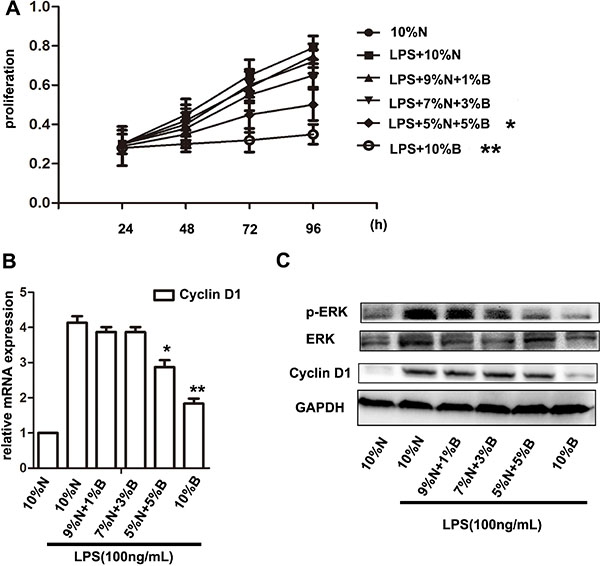 Figure 6: BBD-serum inhibited the LPS-induced HSCs proliferation by ERK signaling pathway. (A) LPS-induced HSCs were treated with a gradient concentration of BBD-serum, and CCK-8 was performed to measure the proliferation at 24 h, 48 h, 72 h and 96 h. (B) The expression of Cyclin D1 in HSCs after administrated a different ratio BBD-serum by RT-PCR at 72 h. (C) Western blot was used to detect ERK and Cyclin D1 expressed in LPS-induced HSCs after treatment with BBD-serum at 72 h. Compared to10% N. with LPS group,*P < 0.05, **P < 0.01; by two-tailed Student’s t test; N: normal-serum; B: BBD-serum.