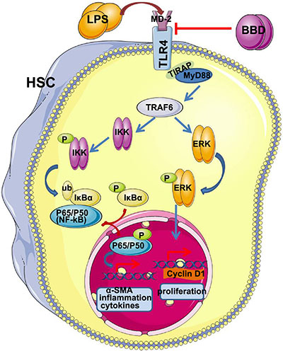 Figure 7: A proposed anti-fibrosis signaling pathway of BBD. BBD inhibits upstream signal TLR4 expression, and via MyD88 dependent pathway in LPS-induced HSCs. In addition, BBD-serum can down-regulated the expression of α-SMA and inflammatory cytokines throughTLR4/NF-κB pathway. At the same time, BBD can inhibit HSCs proliferation via TLR4/ERK pathway. The element was obtained from Servier Medical Art (http://www.servier.com/servier-medical-art) and the figure was designed and drew by Lei Liang.
