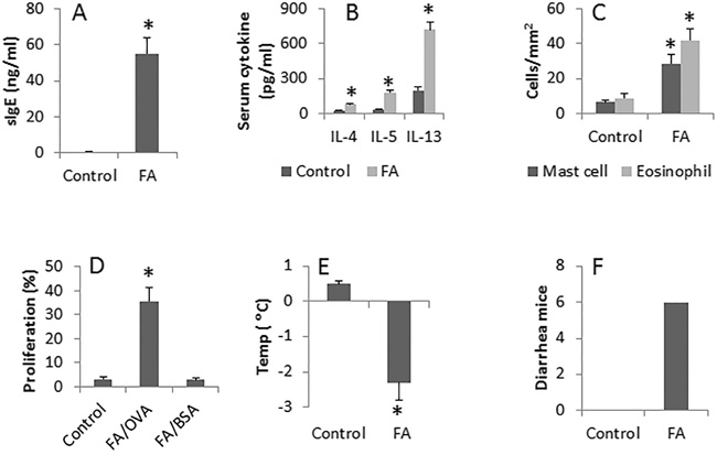 Figure 1: Assessment of allergic inflammation in the mouse intestine. BALB/c mice were sensitized to ovalbumin with cholera toxin as an adjuvant. Control mice were treated with saline. The bars indicate the serum levels of specific IgE (sIgE) (A.; by ELISA), serum Th2 cytokines (B.; by ELISA), the cell counts of mast cells and eosinophils in the intestinal mucosa (C., by histology), OVA-specific CD4+ T cell proliferation (D., by flow cytometry), the core temperature (Temp) drop E. and the mice with diarrhea upon the specific antigen challenge F. Each group consists of 6 mice. Samples from individual mice were analyzed separately. Control: Control group. FA: FA group.