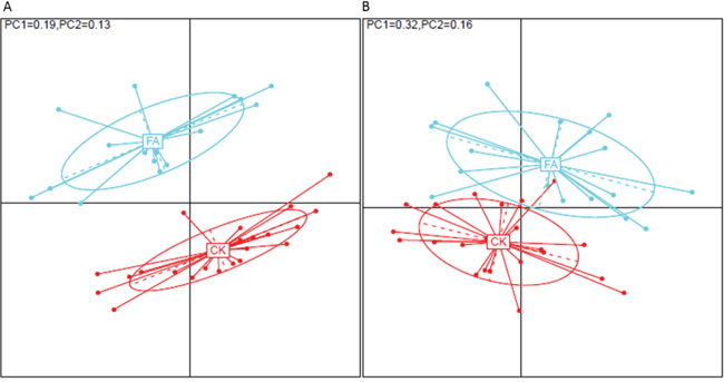 Figure 2: The PCoA based on A. OTU profile and B. genus profile between CK and FA group. The samples from control group (red dots) and from FA group (green dots) show a clear separation on both OTU and genus levels, demonstrating an obviously different in the bacterial species structure of gut microbiota under a FA condition. The contribution of Principal coordinate 1 (PC1, x axis) and 2 (PC2, y axis) are shown on upper left.