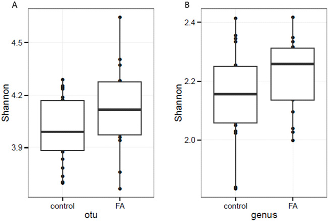 Figure 3: The α-diversity assessed with Shannon index based on A. OTU and B. genus profiles. At both OTU and genus levels, the FA group (n=17) showed higher α-diversity than CK groups (n=22), but not significantly (p value = 0.09 and 0.08 respectively).